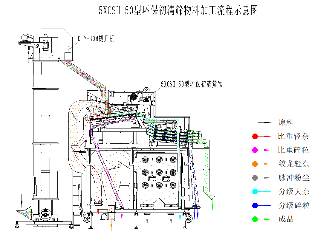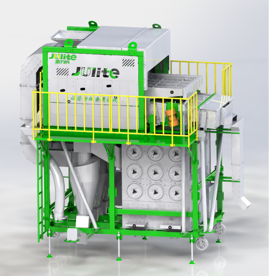 5XCSH-50環(huán)保初清篩主要由上下兩部分結構組成,其中上部分功能為臥式比重風選、分級,下部分功能為二級除塵;物料首先經(jīng)喂入斗進入臥式風選比重臺,通過臥式比重風選分離去除物料中的粉塵、糠殼、碎秸稈、玉米軸芯等輕雜,其中含塵氣體經(jīng)旋風除塵器完成一級除塵,去除粉塵、糠殼等輕雜,經(jīng)過一級除塵的細小粉塵空氣進入脈沖除塵器完成二級除塵,去除更細小的粉塵,達到合規(guī)潔凈排放。臥式比重風選分離后的物料進入一層大雜篩去除大雜,然后并行進入四層小雜篩去除小雜,排出成品。
